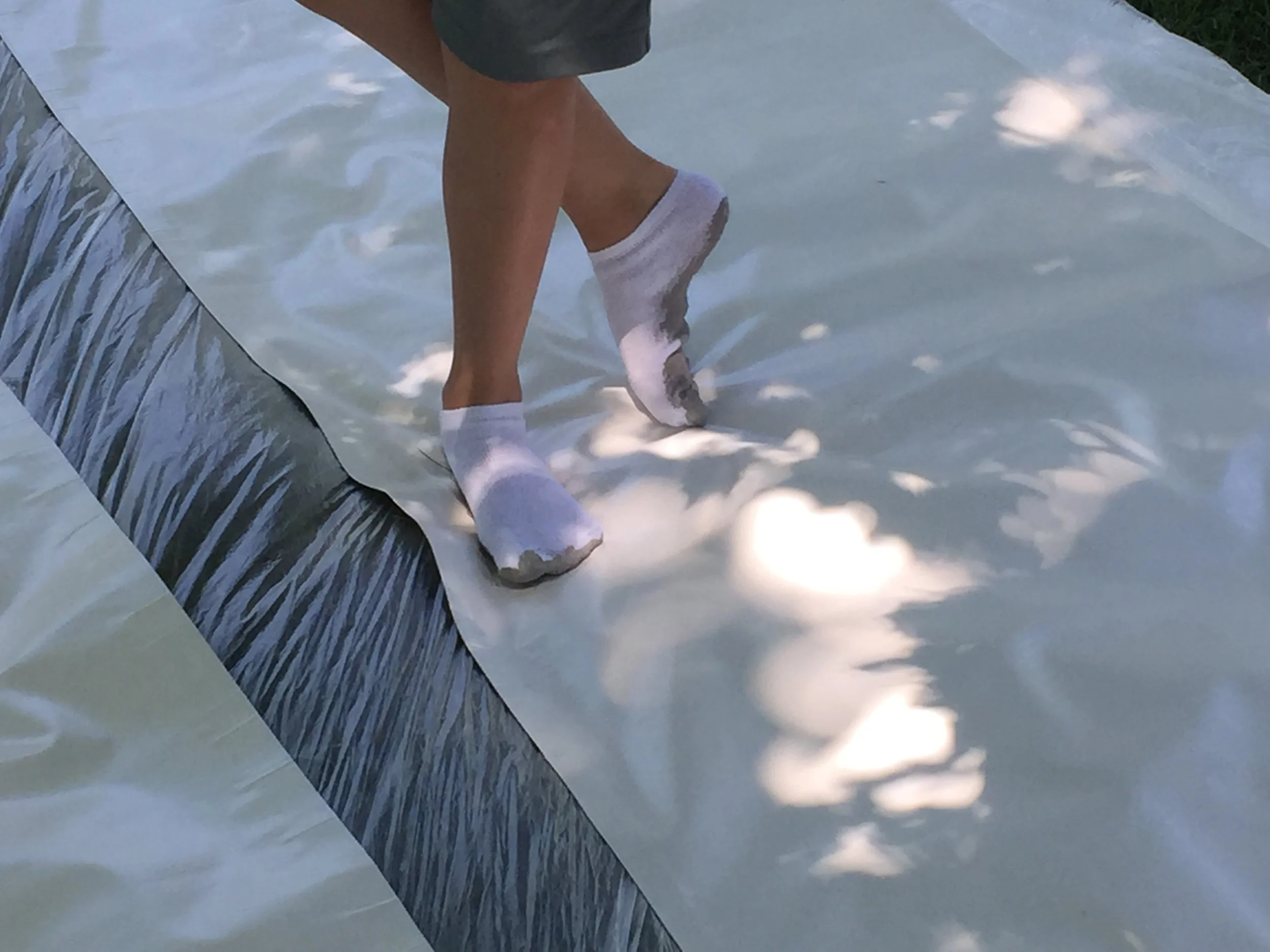 Dancers at the Rise Up School of Dance also created banners to hang on the ceiling of their studio. Three classes worked consecutively, with the first practicing dance techniques on the banners with painted feet. The second group of dancers built on this with markings created using string, brooms, and other miscellaneous tools. The final class responded to the work by finding connections between the marks, adding pattern, and visually accentuating elements.