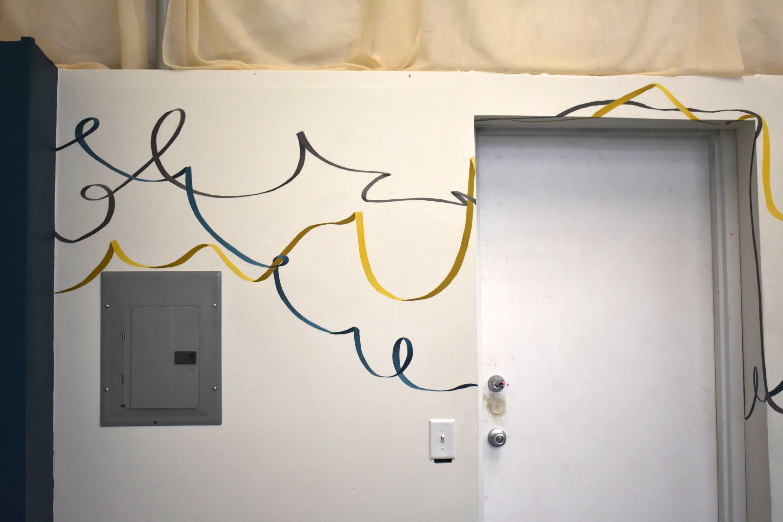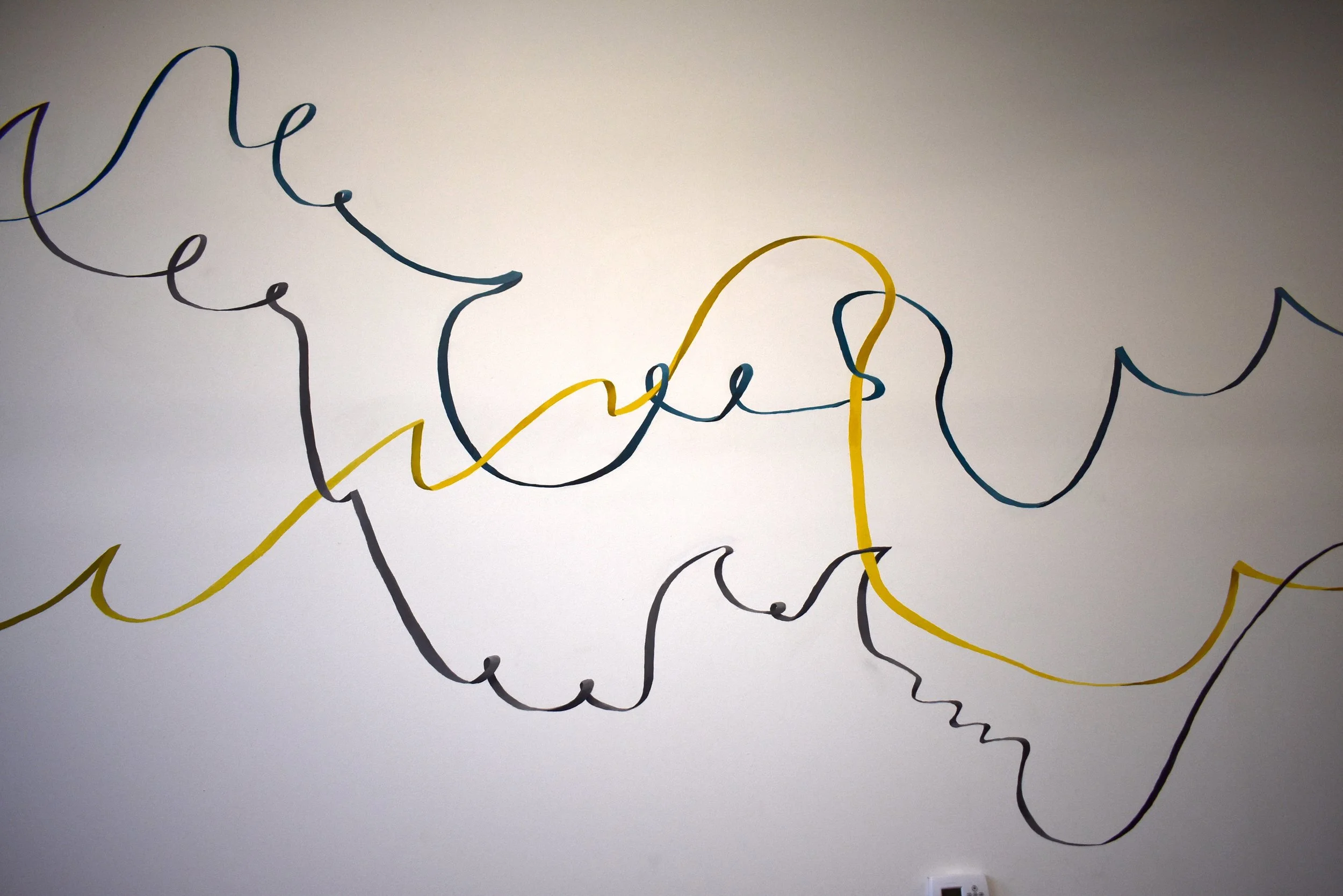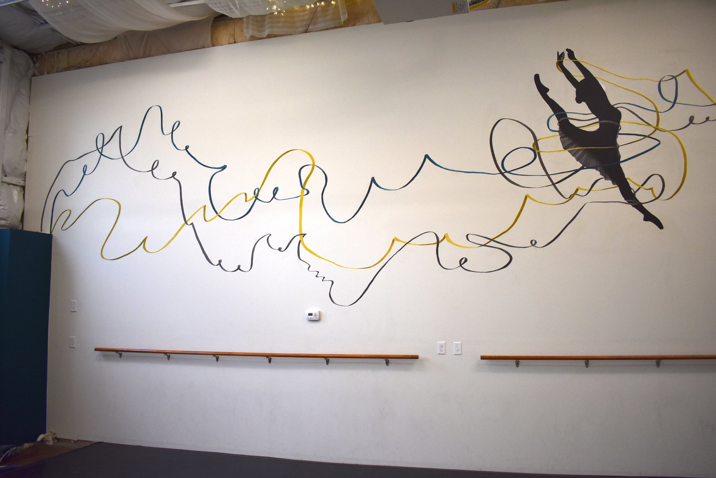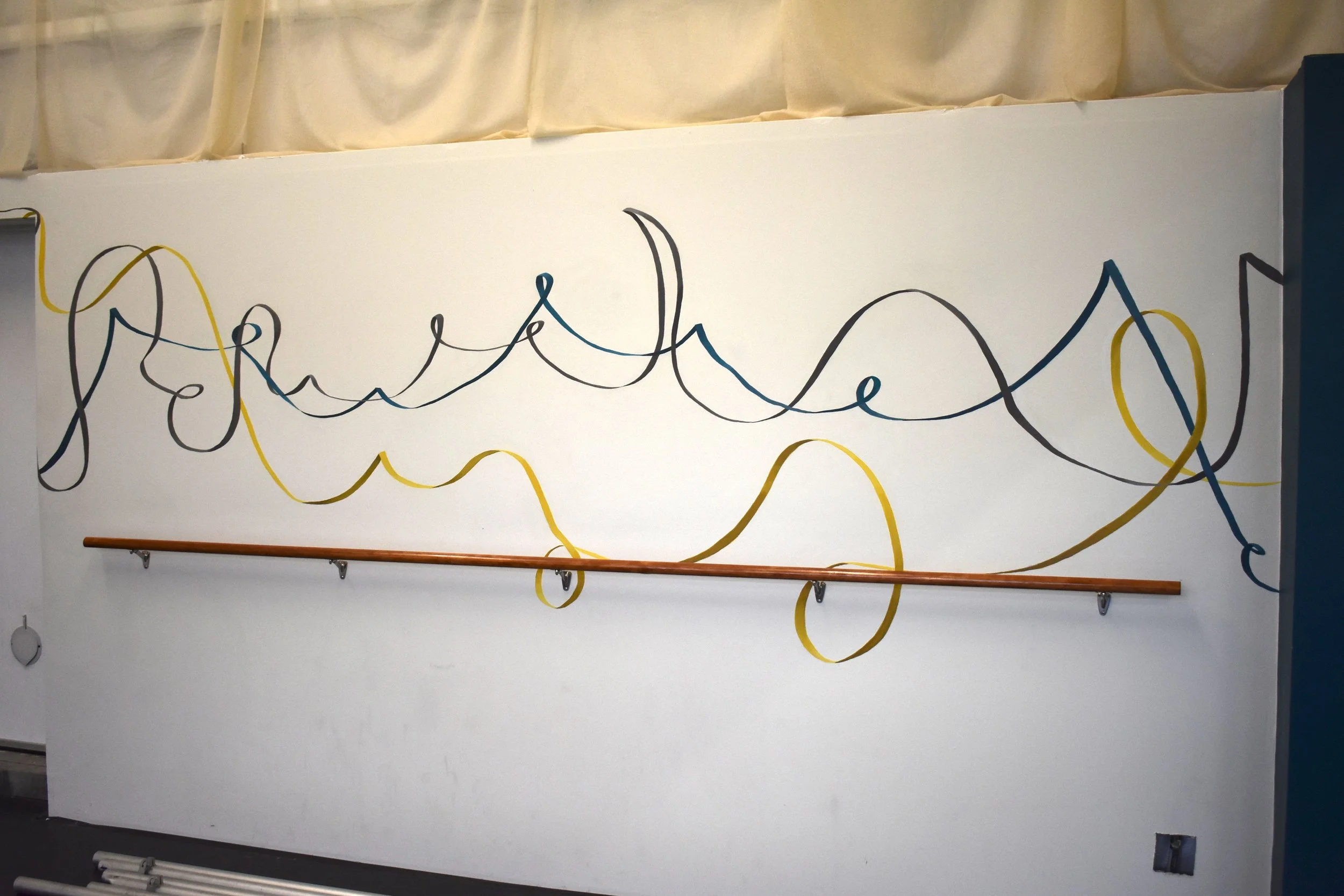 Collaborative mural installed at the Rise Up School of Dance in Salt Lake City, a nonprofit dance studio started by a University of Utah alumnus that provides sliding scale tuition for local youth. Young dancers choreographed performances, which their peers drew as lines. Our group combined these lines into long ribbons, which I painted on the walls of the studio, merging visual art and movement.