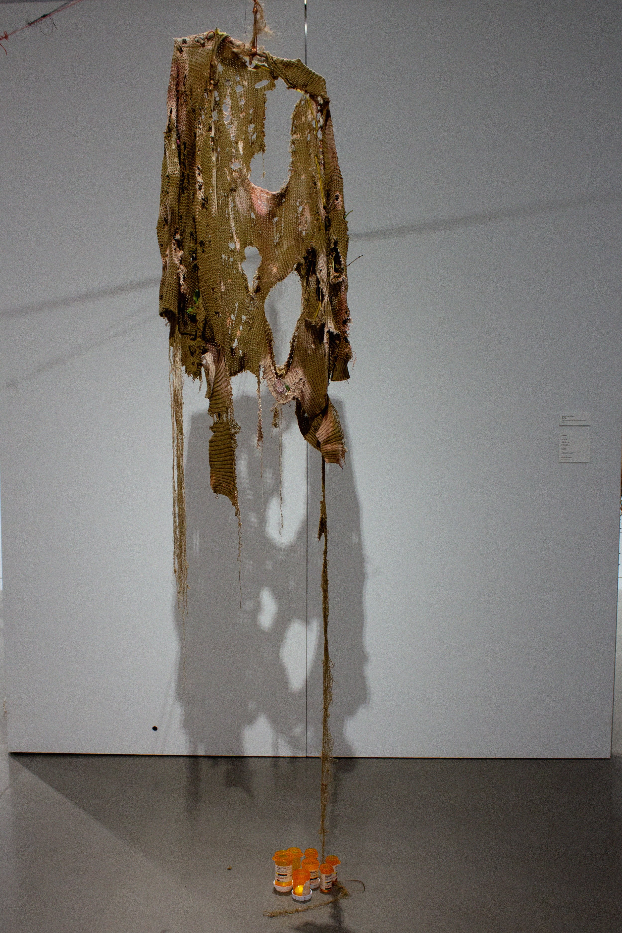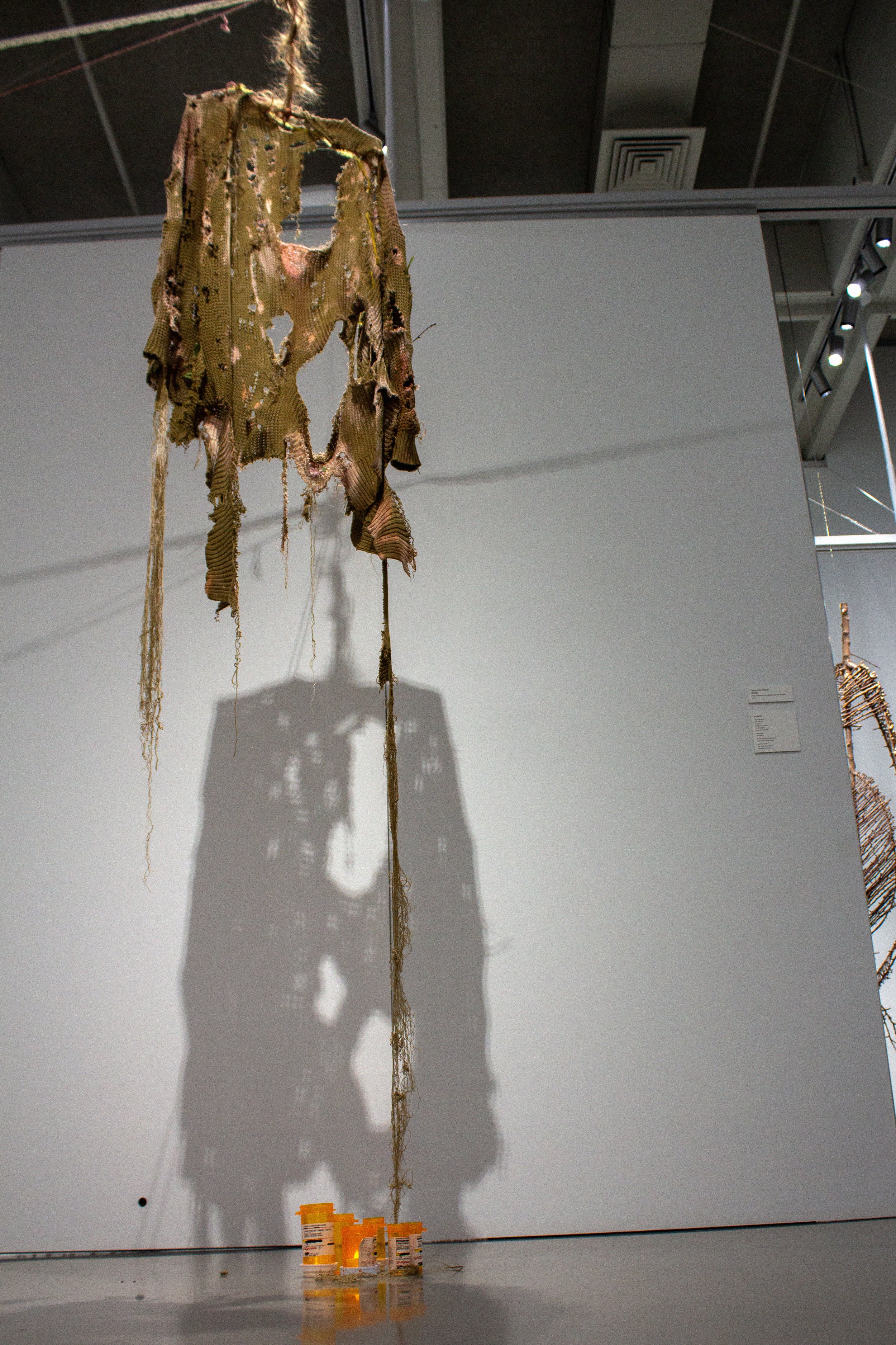 The Fall, 2023. Artist's sweater, hair, and belongings, fibers, wine, tree branches, medication bottles, and flameless votive candles.